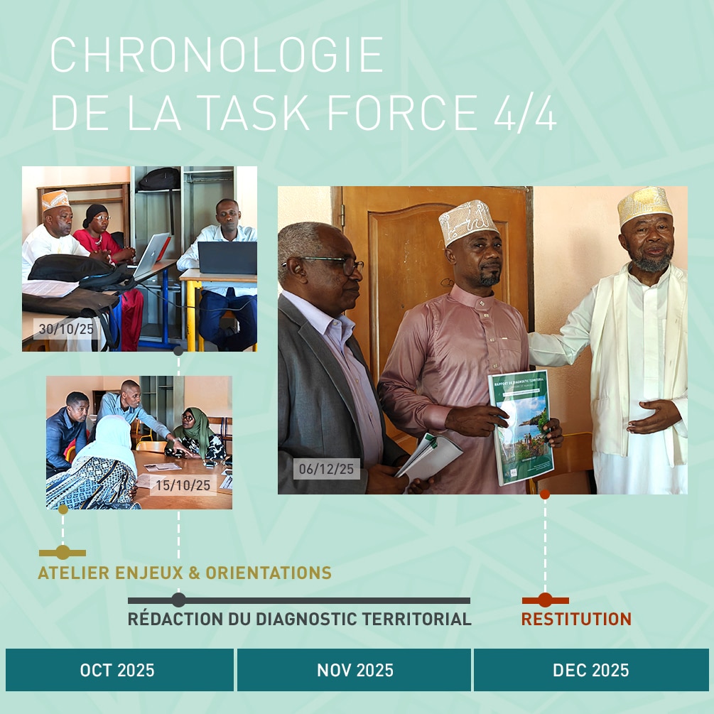 En début d’année 2025, la task force a été constituée. Elle a réuni sept membres issus de l’UCCIA, du Gouvernorat de Ngazidja, de la Direction de l’Aménagement du Territoire, de la Préfecture d’Itsandra-Hamanvou, de la Mairie de Hamanvou ainsi que du village de Diboini. Dès les premières rencontres en mars 2025, une bonne cohésion d’équipe ainsi qu’un réel intérêt des membres pour la démarche ont été constatés.